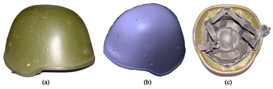 View of the composite combat helmet, model Wz.93: (a) helmet shell; (b) geometric model; (c) helmet lining.