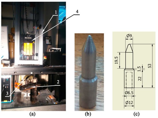 Impact testing stand: (a) impact machine; (b) impactor; (c) dimensioned impactor: (1) impact machine; (2) helmet mounting hooks; (3) mounted helmet; (4) the head being struck.