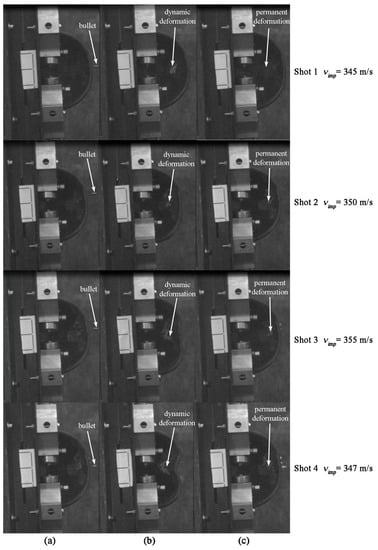 Shadow photographs taken by the high-speed camera: (a) recorded projectile before striking the helmet shell; (b) moment of dynamic deflection; (c) after striking, with the registered permanent deflection.
