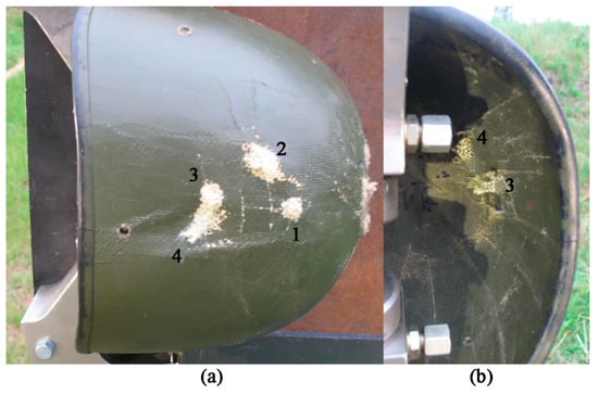 Based on a visual inspection, it was observed that all the hits were stopped, and the deformed projectiles were stuck in the shell. The expected value of xBFD was obtained at 20 mm for shot number 1 and at 22 mm for number 2. The estimated dynamic deflection recorded by the fast camera was within BFD tolerance since it did not exceed 25.4 mm. The measured BDF parameter values are summarized in Table 4. Perforations of the laminate in the inner part of the helmet were observed for the third and fourth shots (see Figure 12). This method was used to assess the protective capability of the helmet’s shell in a series of gunshots. The size of the firing area was kept constant, and shots were arranged in a circle with a diameter of 100 mm. Shot number 3 produced 28 mm dynamic deflection values, and shot number 4 produced 34 mm dynamic deflection values. The BFD range for the third and fourth shots did not fall within the accepted range for safe dynamic deflection. The helmet did not retain its parameters (xBFD) when subjected to a series of shots.