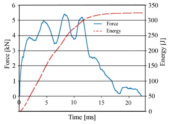 The impact machine recorded the maximum force and energy values of piercing by the cartridges, as well as duration of impact, and dynamic and stable deflection of the helmet. The tests were carried out under piercing conditions identical to those of gunfire, and the diameter of the circle remained at 100 mm. In this case, dynamic deflection results for the helmet shell were twice as large as those from the ballistic tests. This is mainly related to the speed of deformation of the shell helmet during dynamic tests and impulse loads. An example of registered parameters, including maximum force and maximum piercing energy, is shown in Figure 14.