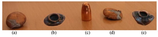 Summary of deformed projectiles as a result of firing at a helmet shell and an undeformed projectile: (a) and (d): fronts of the mushroom projectile; (b) and (e): rear part of the deformed projectiles; (c) undeformed projectile.