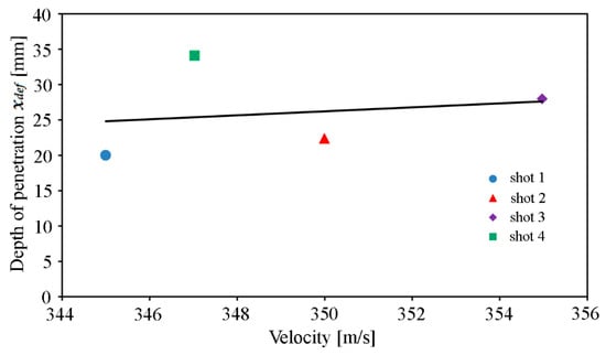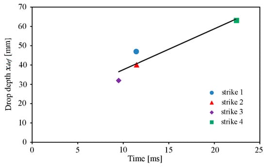The summarized correlations of the scope of penetration as a function of velocity for the 9 mm Parabellum projectile with the Wz.93 combat helmet (see Figure 16) compare favorably for speeds of 350 m/s. At higher pistol projectile speeds, this helmet no longer meets modern criteria, as shown in the graph (see Figure 16). Even though the helmet had exceeded its service life, it still had some good protective properties but only at level II of the standard []. The current standard is level III for 420 ± 15 m/s. Its penetration in the function of time is presented in Figure 17, in order to enable estimation of the duration of the event. In this case, the following results were achieved: the shortest time was recorded for a force value of 4.13 kN where the event time was 9.5 ms. The longest time of 22.4 ms was recorded for a force value of 5.41 kN. The xBFD range grew linearly over time.