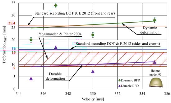 Nonetheless, based on the obtained results, it can be stated that the analyzed structure is only capable of dealing with a single strike. If hits like those of the multi-hit model were recorded, the standards (xdef) would be exceeded. The obtained dynamic deflection and permanent deflection results did not exceed the limit values (see Table 4). As shown in Figure 11b, the estimated dynamic deflection for shot number three or four could cause serious skull trauma, although other results from the firing were within the tolerance limits of current standards (see Figure 18) []. In comparison with data received from the impact machine, dynamic deflection was found to be outside the desired range. The duration of the event was within the required range and (based on []) did not exceed 15 m/s. Estimating the depth of the deflection (xBFD) when determining the BC, where the limit of permanent deflection was estimated to be approximately 7–15 mm [], the registered deflections (see Figure 18) were on the borderline of skull injury (fracture). Referring to Table 3, the likelihood of injury occurrence is, therefore, AIS 3+ for BC.