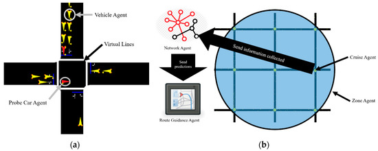 (a) As soon as a Probe Car Agent crosses an intersection, it sends to the Cruise Agent the status of that street; (b) the Cruise Agent transmits to the Network Agent, who makes the prediction.