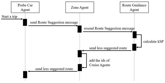 A similar exchange of messages is made between the Probe Car Agent, Zone Agent, and Route Guidance agent. The difference is that: when the Zone Agent forwards the route, it adds a list of Cruise Agents to which Probe Car Agent must report on the situation of the streets through which it crosses.