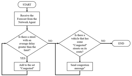 With regard to non-recurrent congestion, the Probe Car Agent carries out detection. If the PCA detects an excessive number of STOP events while crossing a street, it will proceed to send a non-recurrent congestion message to both the Zone Agent and the Network Agent. This message contains a timestamp, street ID, and delay experienced so far. The Zone Agent forwards a non-recurrent congestion message to the Route Guidance Agent and to all Vehicle Agents that that street has on its route. In the case of the RGA, it will verify if the message has updated information and, if so, it will invalidate only the kSP containing the ID of the congested street and update the information of that street in its forecast. Any VA that receives a non-recurrent congestion message should verify how far away it is from the congested road. If the distance is less than a limit defined by the system, it will send a route suggestion message to the Zone Agent. In this case, the message will indicate the current position of the vehicle as point of origin. For its part, the NA will keep this report for later use, during the process of generating a new forecast.
