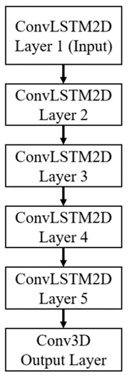 Initially, a two-layer architecture was implemented and evaluated. The training files are segmented using a 20-measurements-wide sliding windows (5 for input and 15 for prediction). The initial network consisted of two ConvLSTM layers with each layer containing 64 hidden states and 3 × 3 kernel. We used a per-GPU batch size of 16 and trained with Adam optimizer, setting learning rate to 10−4. This architecture worked correctly, achieving 75% accuracy. To increase the accuracy of the model, a new ConvLSTM intermediate layer was added. This process is repeated four times more, using the same hyperparameters each time. After several test with different configurations, it was determined that the best configuration was a deep five-layer ConvLSTM network (Figure 5), with an accuracy of 88%. This architecture proved to have a more accurate spatiotemporal sequence prediction capability, which makes it suitable to provide predictions in complex dynamic systems such as the problem of traffic flow prediction.