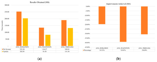 (a) Results obtained for M4 network, both without using the proposal (no system) and using it (system); (b) reductions obtained for different time measures.