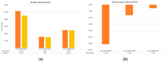 (a) Results obtained for M5 network, both without using the proposal (no system) and using it (system); (b) reductions obtained for different time measures.
