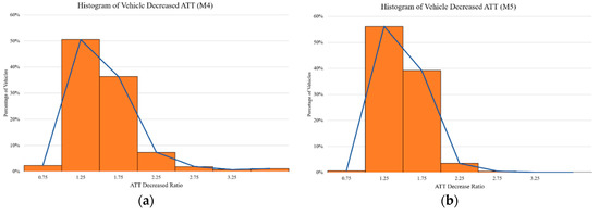 Figure 8 shows the histograms of the improvements of ATT under normal traffic conditions when we use the proposed system. In this case, the improvement ratio is defined as ratio = oldtime/newtime. For example, a ratio of two means that the vehicle was able to complete its trip in half of the time, while a ratio of three means that it finished its trip in one-third of the previous time. As we observed, a large number of vehicles, 51% (M4) and 56% (M5), saved 20% of the travel time (ratio 1.25). Although we can also observe that, there are vehicles that could avoid the worst part of the traffic by completing their trip two or three times faster (relations 2 and 3).