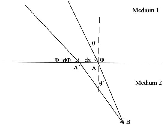 The generalized law has been derived on the basis of Fermat’s principle of the least time as stationary phase []. Fermat’s principle states that out of all the possible paths between two points, light travels on the path which takes the least amount of time []. Consider a plane wave at an incidence angle of θ impinging on a metasurface. Two possible paths that the wave can take are shown in Figure 1. Since the metasurface causes an abrupt change in the phase (phase discontinuity), this change at point A is shown by φ, while on A′ is it is represented by φ + dφ. The distance between A and A′ is assumed to be dx. It is also assumed that φ is a continuous function of x. It is assumed that the two paths are infinitesimally close such that the phase difference between them to reach point A is zero. This leads to the generalized refraction law given by the following Equation (1) [].
