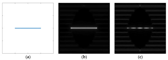 The target was a line consisting of dense points with an interval of 0.1 between x = −5 and 5. The y coordinate of the line target was 0. Figure 2a shows the target location map. Figure 2b shows the imaging of the traditional backprojection algorithm with a synthetic aperture of 5°. Figure 2c is the full aperture imaging of the traditional backprojection algorithm.