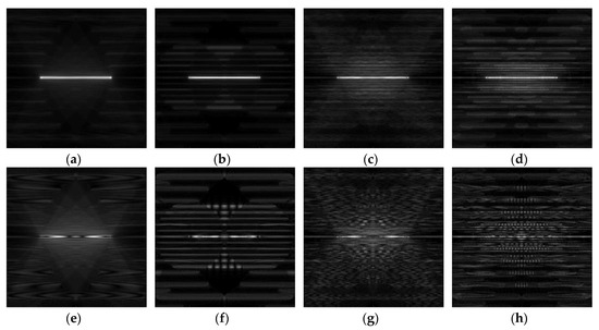 Single line target imaging based on piecewise linear transformation: (a,e) T = 0.5, = 1.5, = 0.5; (b,f) T = 0.8, = 1.2, = 0.1; (c,g) T = 0.9, = 1.2, = 0.1; (d,h) T = 0.95, = 1.2, = 0.1.