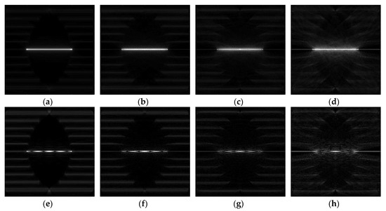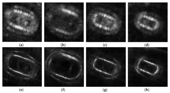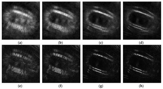 Figure 3 is the imaging result of adding the gamma transformation to the modulus stretch based on the backprojection algorithm. Figure 3a–d shows the results of gamma transformed imaging with a synthetic aperture of 5°. Figure 3e–h shows the results of coherent imaging with full aperture after gamma transformation of images at each time . The gamma transformation parameters of a–e and e–h in Figure 3 were 1.2, 2, 3.5 and 5, respectively.