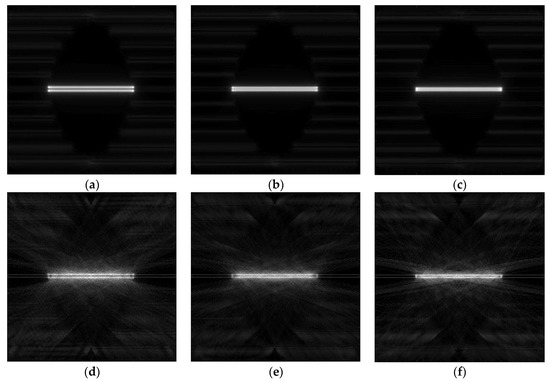 Double-line target imaging with a synthetic aperture of 5°. The piecewise linear transformation parameters are T = 0.95, = 1.2, = 0.1: (a,d) The distance between the two lines is 0.4; (b,e) The distance between the two lines is 0.3; (c,f) The distance between the two lines is 0.2.