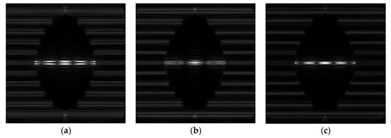 Considering the obtained by Equation (3), when is fixed, it is essentially a one-dimensional function determined by the slant range difference . At a given time , the same corresponds to the same , and the same interpolation is obtained. Therefore, the imaging results of the whole scene are only related to the . A series of bright and dark stripes perpendicular to the azimuth of the radar are obtained by imaging the modulus of . A location at the same distance from the radar in the scene has the same brightness. The angle of the stripes changes with different . The scattering properties of the target also exhibit different echo data as the angle changes, as shown in Figure 1.