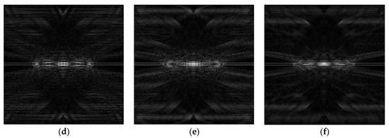 Figure 6a–c is the imaging result of a traditional backprojection algorithm with a synthetic aperture of 5° when two lines are 0.4, 0.3 and 0.2 apart. Figure 6d–f is the imaging results of Figure 6a–c after piecewise linear transformation based on a 5° synthetic aperture. It can be seen that the traditional backprojection algorithm can distinguish the two lines when they are 0.4 apart. When the distance is shortened to 0.3, it is more difficult to distinguish the two lines. When the distance is shortened to 0.2, the imaging results of the traditional backprojection algorithm are completely indistinguishable from the two lines. However, the imaging results after piecewise linear transformation can distinguish the two lines in all cases.