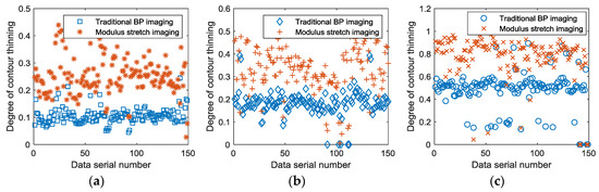 Data for 150 vehicles were randomly selected from the Goctha dataset, and they were individually imaged by the traditional backprojection algorithm and by the modulus stretch with piecewise linear transformation. Then the degree of contour thinning was calculated and is shown in Figure 11.