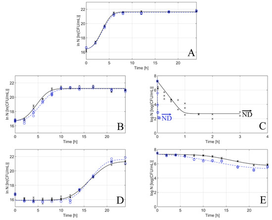 Parameters of the models were estimated via the minimization of the sum of squared errors, using the lsqnonlin routine of the Optimization Toolbox of MATLAB version R2018b (The Mathworks, Inc., Natick, MA, USA). For fitting purposes the results were logarithmically transformed. For the growth model of Baranyi and Roberts [25], results were expressed as ln (CFU/mL), because the model involves the natural exponential function to describe the growth phase. For the inactivation model of Geeraerd et al. [26], results were expressed as log (CFU/mL), because the model, as all inactivation models, requires the reduction of microorganisms to be expressed in log units. In order to avoid apparent SI caused by small fitting differences, the initial cell density N0 was set to be equal to the average of the cell densities at time zero of the individual replicates on the selective and nonselective medium for each condition, i.e., approximately 7 log (CFU/mL) or 16 ln (CFU/mL).