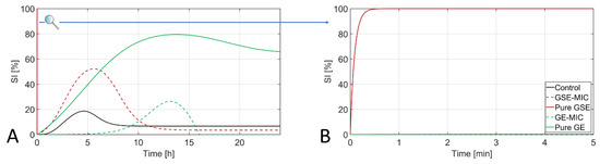 Sublethal injury (SI) of Listeria monocytogenes for different bioactive extracts and their concentration as indicated for the control, GSE-MIC, pure GSE, GE-MIC, and pure GE. Since SI for Pure GSE could only be calculated up until a treatment time of 5 min, SI is represented over a period of 24 h (A) and 5 min (B). SI was calculated using Equation (9) with the modeled values from Figure 1 as input.