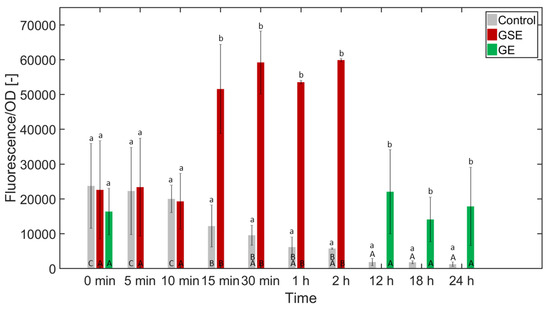 Permeability of Listeria monocytogenes to PI after exposure to the control, pure GSE and pure GE. For GSE, samples are taken after 0 min, 5 min, 10 min, 15 min, 30 min, 1 h, and 2 h. For GE, samples are taken after 0, 12, 18, and 24 h. For the control, samples are taken at all aforementioned time points. Results are expressed as Fluorescence/OD ± standard deviation (n = 6). For the same medium (control, GSE, or GE), bars bearing different uppercase letters are significantly different (p ≤ 0.05). For the same exposure time, bars bearing different lowercase letters are significantly different (p ≤ 0.05).