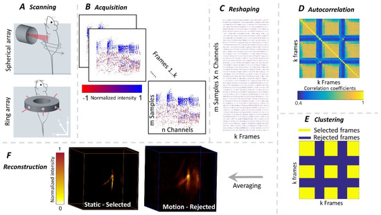 A schematic diagram of the steps involved in the motion rejection algorithm. (A) Two- and three-dimensional scanning systems, (top) spiral volumetric optoacoustic tomography (SVOT) based on a spherical array of transducers and (bottom) cross-sectional optoacoustic tomography based on a full-ring array of cylindrically focused transducers. (B) Sequence of frames (sinograms) acquired at a single position of the scanner. (C) Rearrangement of the data corresponding to the entire sequence into a single matrix. (D) Correlation coefficients of the autocorrelation matrix of the columns in (C). (E) K-means clustering of the correlation coefficients matrix into two groups, namely, selected (static) frames and rejected (motion) frames. (F) Volumetric image of a blood vessel reconstructed with data from the selected versus the rejected-frames.