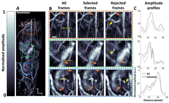 A whole-body (neck to hind paws) SVOT image, reconstructed using the frames selected with the proposed motion rejection approach, is displayed in Figure 2a. In these experiments, an average of 32% of frames were rejected per transducer position. The effectiveness of the motion rejection approach is demonstrated by analyzing three specific regions (dashed squares in Figure 2a). Specifically, we compare the image combining all the frames, with the one obtained by averaging the selected (static) frames as well as the image obtained by averaging the rejected (motion) frames. Note that the red square partially captures the thoracic region. It can be observed that a small vessel, clearly visible in the image rendered from the selected frames (Figure 2b, red arrow), cannot be resolved in the image reconstructed using all the frames. Furthermore, the former image features a clear motion artifact in the form of a ‘double vessel’ (red arrow), thus concealing the small vessel. The green square captures the region around the liver. A vertical vessel appears regular and complete in the selected-frames image (red arrow), whereas the same vessel appears disrupted in the all-frames image. Also here, the rejected-frames image discloses an artifact responsible for distorting the all-frames image. Finally, the blue square captures part of the abdomen. Clearly, small vessels are better resolved in the selected-frames image (red arrows). Notably, different structures appear to be blurred (yellow arrows) in the rejected-frames images with respect to the selected-frames images. A comparison between amplitude profiles of structures labeled by dashed yellow lines in Figure 2b further emphasizes the effectiveness of the motion rejection algorithm (Figure 2c) with the signal amplitude typically improved by 10% to 30% in the selected-frames images. Likewise, fine details appear more prominent in the selected-frames images, which is evinced by additional, fine peaks in the amplitudes profiles.