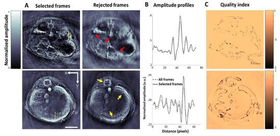 Motion rejection results for cross-sectional imaging with the ring array system. (A) Reconstructed transverse slices of a mouse for two different locations rendered by considering the selected (left) versus rejected (right) frames (scale bar—1 cm). Distorted structures are marked (red and yellow arrows). (B) Amplitude profiles (of yellow dashed lines in (A)) for the images rendered with all (dashed line) versus selected (solid line) frames. (C) Distortion-based QI of the difference between the selected- and all-frames images (1 = high similarity; −1 = low similarity).