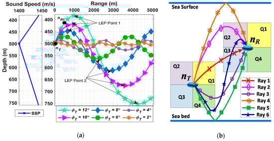 Underwater Propagation of Acoustic Signals: The underwater environment is characterized as an inhomogeneous medium, such inhomogeneity is due to point-to-point changes in underwater characteristics such as temperature, salinity, and pressure (depth) []. Essentially, underwater inhomogeneity is mainly manifested by means of observing the sound speed profile (SSP) of the water column. Such variation of sound speeds (SS) along the propagation path of acoustic signals causes refraction and often yields a continuous change in the gazing angle of a propagating signal. Thus, to find the propagation path of transmitted acoustics signals, ray tracing mechanisms are leveraged to infer the trajectory of each ray. Although, current ray tracing algorithms yield a good approximation of the actual acoustic signals, they require estimating a propagation path within each layer and then concatenating them to come up with the full path. Moreover, maintaining communication with mobile or drifted nodes often requires estimation of the best communication angle that is usually not necessarily contiguous to the previous one. To illustrate, let us consider the example in Figure 1a, where initially node lies on the path of the ray transmitted by node at an angle . As node drifts horizontally to the right, shifts to the ray transmitted at angle to maintain communication. When drifts further to the right, transmitting at smaller angles will not establish communication with since all these rays will refract until a local extremum point (LEP) is disclosed along the propagation path prohibiting the ray from reaching , as illustrated in Figure 1a. Thus, node must use a different type of ray to reach where a ray with a single LEP is to be used to reach . Therefore, it is not enough for nodes to know the location of neighboring nodes, but they also need to classify rays into different types and determine the ranges of each one to enable switching among rays to maintain a communication link. Figure 1a indicates that when SSP conditions are favorable to produce multiple differentiable LEPs, the angle of transmission plays an important role in determining the location of the LEP. Specifically, as the angle of transmission changes from 0 to 10°, we observe that horizontal range to a LEP grows, indicating that for a transmission angle more than 4°, only few iterations are needed to determine the number of LEPs within the transmission range of a node. Moreover, for transmission angles less than 4°, a node may resort to a straight-line model as the variation in angle is minimal.