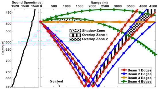 Illustration of shadow and overlapping regions where a transmitter is placed at depth of 500 m while the seabed is at 850 m. The left figure shows the sound speed profile while the right one shows the ray propagation path where the inhomogeneity of the medium complicates the spreading pattern of waves. Nodes laying in the shadow zones will not detect the transmitted waves while node in the overlapping regions receive multiple transmissions.