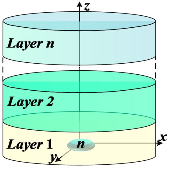 The underwater medium is viewed as a layered model based on the observed SSP of the water column. Since the horizontal changes in SS are limited whereas changes in the vertical direction are significant, we use a layered approach to discretize and capture SS changes along the depth []. In principal, the SSP of the water column is divided into isogradient layers where each layer has a constant gradient. Since the operational environment is 3D, we represent each layer as a disk with a thickness that is equivalent to the thickness of layer along the -axis. Therefore, the layered model could be visualized as stacked disks, as shown in Figure 3, where the SS gradient in each layer is assumed to be constant. We further assume that nodes obtain the SSP of the water column either by measuring the water column SSP or referencing data collected by field experiments in the same deployment area []. Finally, we have proposed a method to determine the SSP from established communication links where we exploit the fact that the paths of acoustic signals are highly correlated to the SSP of the water column []. In the event that the SSP changes, we assume that either such a technique can be leveraged to deduce the changes in the SSP, or new measurements are taken by the node to reflect the latest SSP.