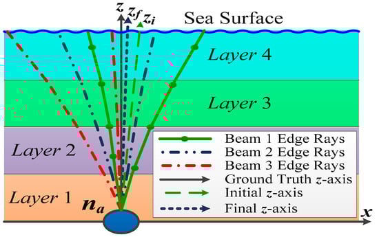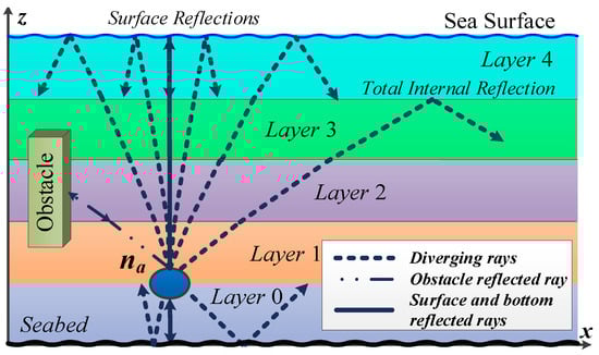 Let us assume that node picks distinct transmission channels where . Then, beacons are transmitted on every channel such that each beacon has a fixed phase and is appended by a unique identifier. Once all messages are transmitted, enters a listening phase where it is particularly interested in receiving a reflected version of its transmitted message from the same angle it was transmitted on. Basically, identifying a reflected signal is a two-step process where first compares the identifier extracted from the received reflected signal to that of the transmitted message in the same direction. Since the underwater medium is inhomogeneous and non-symmetrical in general, only reflected signal from the sea surface, sea bottom and nearby obstacles are envisaged to bounce back to the transmitter. Moreover, the surface and bottom reflections will be limited to those beams incorporating a ray that is perpendicular to both the underwater layer boundaries and the bouncing surfaces; this is because any inclination of the ray will be amplified by both refraction and surface reflection and will cause the ray to divert away from the sender, especially for deep water scenarios as shown in Figure 5.