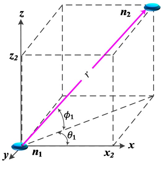 Representation of the spherical coordinate system where the angle lies in plane, the angle lies in the plane and the length of the vector connecting the nodes is denoted by .
