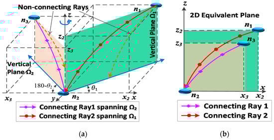 Conceptual representation of connecting rays where two distinct vertical subspaces are shown with their respective connecting-rays. To map the 3D environment (a) into 2D (b), we rotate each vertical plane along the -axis until all the vertical planes merger into a single plane referred to as the process of superimposing subspaces.