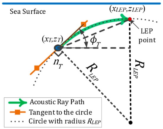 where in the above equation is either zero or the depth of the seabed depending on the surface the transmission angle is facing. Although the use of the straight-line propagation model does not factor in medium inhomogeneity, it suffices in identifying the type of received ray within a range of 5 km as will be shown in Section 5.2. On the other hand, if is lower than the maximum value found in the SSP of the considered region, node confirms its assumption of purely refracted ray and extracts the -coordinate of the LEP . Node then factors its depth (zT) and the corresponding measured value to compute the SS gradient of the layer enclosing both pairs and the transmitted ray, i.e., . Once the gradient is obtained, a node employs Equations (2) and (3) to deduce a radius . Then, the for refracted rays facing a differentiable LEP can be found by using simple trigonometry manipulations, as illustrated in Figure 9. Essentially, nodes regard the depth in the interval as a single layer and find the circular arc that approximates the signal propagation path. Since the transmission angle forms a tangent to the estimated circular propagation path and due to the fact that the tangent is perpendicular to the line connecting the node to the center of the circle, the center of the circle can be uniquely identified. Moreover, since the gazing angle is zero at the LEP point, the line connecting the LEP point and the center of the circular arc is always parallel to the -axis. Thus, can be mathematically expressed as follows: