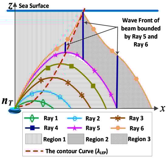 The ray classification technique discussed in Section 4.5 determines the type of ray given an established communication link, yet, it cannot provide the range beyond which one type of ray cannot be used by a transmitter to reach a receiver. To determine the range of each ray type, nodes leverage the SSP and the possible transmission angles to determine the location of LEPs. Since the transmission angle is bounded in the open interval , nodes first estimate the location of LEPs for all transmitted signals. Specifically, using Equation (4) the range of angles () at which is first calculated. For each angle within , the node leverages Equation (6) and notes the location of the LEPs. Utilizing the maximum angular value in a node applies Equation (5) to determine the location of a non-differentiable LEP. As shown in Figure 10, connecting all LEPs noted by node yields a contour that can be leveraged to identify four different zones. The first zone is labeled in Figure 10 as Region 1 where only direct and surface reflected rays can establish a communication link. In the second zone, Region 2, only reflected and rays facing a single LEP can reach the receiver, i.e., direct ray connections are ruled out. For the third zone, labeled as Region 3, the direct ray is forced to spread out to the extent that it drops below the receiver sensitivity especially for long range communication. In particular, a beam bounded by Ray 5 and Ray 6 does not spread much before reaching . However, as soon as the beam approaches the contour, a rapid stretch is exerted onto the beam’s wave-front by the SSP as shown by the size of the lines representing the wave-front in Figure 10. Considering the spreading losses only, the law of energy conservation states that the energy must be evenly distributed along the curve representing the wave-front of a beam. Furthermore, since a line approaching from the left and right significantly vary in size, the beam’s energy must spread evenly across such lines. As a consequence, beams transmitted with a finite energy must spread rapidly and hence the acoustic energy at the receiver transducer located after will be significantly lowered and becomes undetectable. Thus, for Region 3, neither direct rays nor rays facing a differentiable LEP can reach and only reflected rays can cover such a region. The final zone is the white space shown in Figure 10; such a zone is not reachable by using any angle, i.e., a permanent shadow zone.