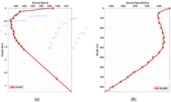 The (Sound Speed Profiles) (SSP) extracted from World Oceanic Database (WOD) database with part (a) showing the first SSP (labeled M-SSP1) measured at coordinate of N40° 31′ 24.179″ W127° 35′ 52.27″, and (b) signifies the second SSP (labeled M-SSP2) measured at N20° 7′ 18.0624″ W 175° 56′ 17.3436″.