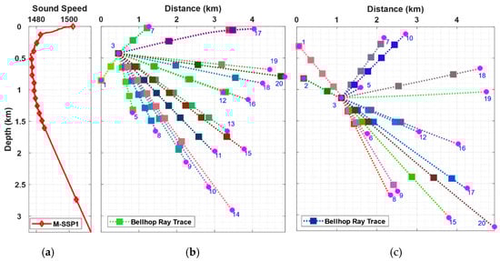 To validate our approach, we have deployed nodes in different configurations and within both M-SSP1 and M-SSP2. To fully test the proposed algorithm’s capability, we generated within M-SSP1 and M-SSP2 more than 1600 rays and used the proposed ray classification technique to determine the ray type. When applying our approach, 96% of the rays are classified correctly while only 4% were misclassified. We have chosen four different configurations shown in Figure 12 as examples to fully comprehend the reasons behind the observed 4% error. The figure displays the Bellhop eigen rays generated for node #3 and the location of its neighbors. In the configuration shown in Figure 12b our approach manages to classify all rays correctly except for two rays. The first ray terminates at node #7, where the depth of the node is 1.4 m, i.e., is located very close to the sea surface. In this case the value of is higher than the maximum SSP value; thus, a reflection was assumed and the value of was obtained using a straight-line approximation. The location of the was found to be 18.3 m before the location of node in an actual horizontal range of 800 m, i.e., an error of 2.28% in calculating the location of the LEP. Thus, the algorithm assumes that the ray was received immediately after it was reflected from the sea surface and categorized the direct ray into a ray facing a single nondifferentiable LEP. Similar conclusion can be made for ray terminating at node #17 where the ray was classified falsely as having three LEPs while it experienced a single LEP. A closer look at the location of the second LEP reveals that it was estimated to be 5.5 m before the actual location of the node. Since the quadrants of transmission and reception mandates and odd number of LEPs, the nodes opted to choose a three LEP propagation path. Moreover, in both cases, the proximity of the node is extremely close to the location of the LEP and given the actual range value the error is classified as insignificant. Such errors can be filtered out by adding some error cushion to the actual LEP location where if a node is within a marginal proximity of the LEP, it ignores the last LEP. When classifying the rays using the configuration used in Figure 12c, the direct ray terminating at node #20 was erroneously categorized as having a single LEP. Since the calculated value of was larger than the observed SS in the water column, the algorithm opted to use a straight-line approximation and found the first LEP point 78 m before the node location. Moreover, node #20 is located at a horizontal distance of 4938 m, i.e., at the extent of the simulation area. At such a large distance, the straight-line model managed to retain an absolute error of 78 m and hence is deemed appropriate for estimating reflected ray paths to an extent of 5 km.