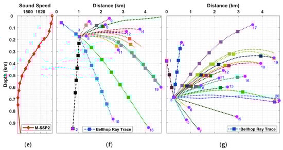 In part (e) and (f) of Figure 12, M-SSP2 is utilized to show different refraction patterns than those used in the previous examples. Since most of the transmission angles in part (e) are close to the horizontal axis and due to the fact that the SSP is not symmetrical, a new environment is introduced to validate the proposed algorithm. We observe that the ray classification algorithm produces error only in three cases and in the remaining 40 rays shown in parts (e) and (f) were classified correctly. For the 3 cases, similar findings are observed as those found in part (b) and (c). Thus, the four different configurations shown in Figure 12 demonstrate the capability of our ray classification technique in identifying the ray type for node located at ranges less than 5 km.