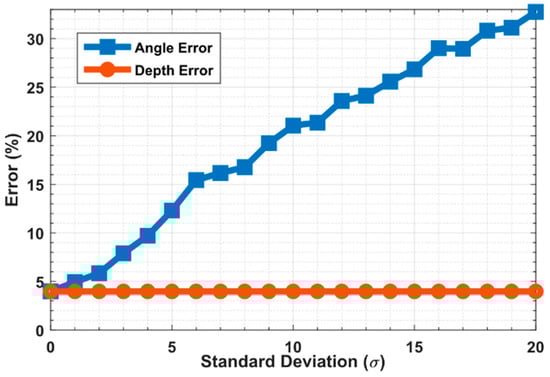 The classification error trend when the angle of transmission and depth are subjected to an additive gaussian error with zero mean and standard deviation depicted on the -axis.