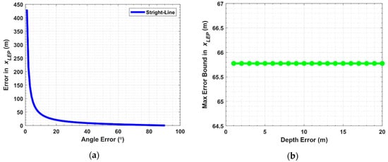 Moreover, since the temperature in underwater environment is limited between 30 °C and −1.7 °C, the achievable SS values in practical oceanic environments are limited within the interval (m/s) []. Using such limits in Equation (4) yields a maximum angle of transmission of 27.6° to have a LEP. Furthermore, the ratio is always greater than one since must be greater than to achieve a LEP. Using the values within we can obtain a maximum value for the ratio in actual underwater conditions and show that it cannot grow beyond 1.13. Coupling all the information above, a maximum bound on the depth-caused error is given by in actual sea water conditions. Thus, when determining the value of for a differentiable LEP and if an error equivalent to “” is experienced in determining the depth, the position of will face a maximum error of .