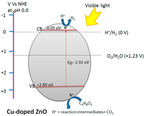Proposed reaction mechanism for H2 production from a glycerol aqueous solution using Cu-doped ZnO under visible light (CB: conduction band; VB: valence band).