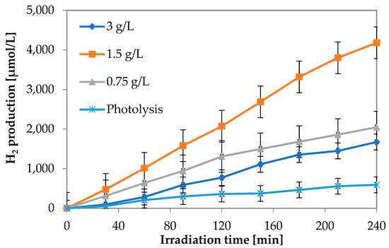 Figure 3 displays the hydrogen production for the different 1.08Cu_ZnO dosages as a function of visible light irradiation time. As expected, very low H2 production was observed for the photolysis test (without the photocatalyst). In the opposite way, the photocatalytic H2 production from the glycerol solution was significantly enhanced in the presence of the 1.08Cu_ZnO photocatalyst in the glycerol aqueous solution. At a fixed irradiation time, there was an increase of hydrogen production up to a 1.08Cu_ZnO dosage of 1.5 g/L (4180 μmol/L of H2 after 4 h of visible light irradiation). Beyond this value of catalyst dosage, the photocatalytic performances worsened. In particular, at 3 g/L of catalyst dosage, the hydrogen production was 1670 μmol/L lower than that obtained with 0.75 g/L of catalyst dosage. The worsening of photocatalytic activity may be explained by the increased opacity of the aqueous solution, which made light penetration through the solution increasingly difficult [53]. Therefore, the optimal catalyst dosage was 1.5 g/L and it was used to evaluate the influence of the initial glycerol concentration in aqueous solution and the effect of pH of solution.