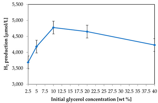 The results showed that hydrogen production increased with the increase of the glycerol concentration up to 10 wt % and then decreased for 20 and 40 wt % of glycerol initial concentration. Thus, the optimum glycerol concentration is to be considered equal to 10 wt %, with hydrogen production of 4776 μmol/L, as reported. The effect of the sacrificial agent initial concentration for photocatalytic hydrogen production has been extensively discussed in the literature. In particular, some studies have evidenced that this behavior follows a Langmuir-type isotherm [54,55,56], meaning that the photocatalytic hydrogen production rate is controlled by saturation of active centers by the adsorbed glycerol molecules [32]. However, in the present study, the interpretation of the data through a Langmuir-type isotherm does not adapt to the obtained experimental results; rather, the results show the existence of an optimum glycerol concentration. The worsening of the photocatalytic activity beyond the optimal value of the initial glycerol concentration can be attributed to the blockage of the adsorption of H3O+ on the active site’s surface [32]. Moreover, the existence of a maximum value for hydrogen production as a function of initial glycerol concentration could be also attributed to the action of glycerol as a quenching agent for ions and radicals generated during the irradiation [18].