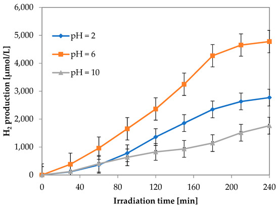 Photocatalytic hydrogen production during the irradiation time at different initial pH levels of solution. Glycerol initial concentration: 10 wt %; catalyst dosage: 1.5 g/L; visible light intensity: 32 mW/cm2; photocatalyst: 1.08Cu_ZnO.