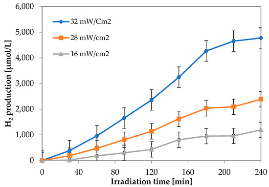 As expected, at a fixed irradiation time, photocatalytic hydrogen production increased as LED light intensity increased due to the photogeneration of more electrons and holes [58]. These results are in agreement with the literature data that highlight the effect of light intensity on the performances of photocatalytic processes [59,60].