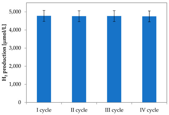 The highest H2 production was obtained at pH equal to 6 (H2 production equal to 4776 μmol/L). It was evident that the change in pH had in any case worsened the overall production of hydrogen, which in acidic conditions was equal to 2771 μmol/L and in basic conditions was only 1764 μmol/L. Therefore, the best result was obtained by operating at the spontaneous pH of the glycerol aqueous solution (pH = 6). This can be seen as an advantage, particularly from an economic point of view, since it is not necessary to use additional chemicals to change the pH in order to improve the production of hydrogen. The increase of hydrogen production observed with the increase of initial pH from 2 up to 6 was consistent with the literature concerning glycerol photoreforming [17]. The best hydrogen evolution rate could be related to the adsorption of glycerol on the photocatalyst surface [17,18], the charging behavior of the semiconductor surface, the size of the aggregates of the photocatalyst particles, as well as the positions of the valence and conduction band levels of the semiconductor with respect to those of the redox couples in solution [57].