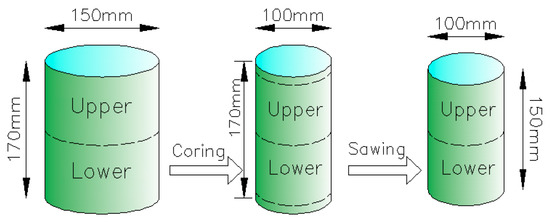 During the manufacturing procedure of specimen, for each group of samples, firstly, one loose asphalt mixture was separated into two half portions, which have the same mass but different asphalt content, with one prepared for the lower layer of the cylindrical mold and another for the upper layer. The mass of the whole loose mixture was determined by the sample density obtained by the former Marshall test and the volume of SGC sample (170 mm × Φ150 mm, i.e., 150 mm in diameter and 170 mm in height). Secondly, the lower half portion mixture was poured into the mold and then slightly tamped with a tamping rod. Thirdly, the upper half portion was poured over the top of the mold and then tamped slightly. Fourthly, the whole mold of mixture containing two layers was compacted into a cylinder of 170 mm × Φ150 mm by a SGC. Then, the standard SPT sample of 150 mm × Φ100 mm (100 mm in diameter and 150 mm in height) was obtained by coring and sawing the SGC sample (170 mm × Φ150 mm) with a core-drilling machine and an electric saw (cut the top and bottom of the samples 10 mm each). Air void content for all standard SPT samples was controlled as 4 ± 0.5%. The preparation procedure and demonstration of samples are shown in Figure 2 and Figure 3.