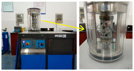 In this study, Superpave Simple Performance Tester (SPT, IPC Global Corporation, Bonny Hills, Australia), a servo-hydraulic machine, was adopted for the dynamic modulus test (Figure 4). Three different testing temperatures (20 °C, 35 °C, 50 °C), and nine different loading frequencies (25 Hz, 20 Hz, 10 Hz, 5 Hz, 2 Hz, 1 Hz, 0.5 Hz, 0.2 Hz, 0.1 Hz) at each temperature, were adopted to be successively applied to the cylindrical asphalt mixture samples. During the whole test, sinusoidal axial compressive stress was imposed on samples and the strain was controlled to the range of 85–115 με according to the recommendation of NCHRP9-19 (National Cooperative Highway Research Program 9-19, USA), and the test was under the condition of uniaxial unconfined pressure.